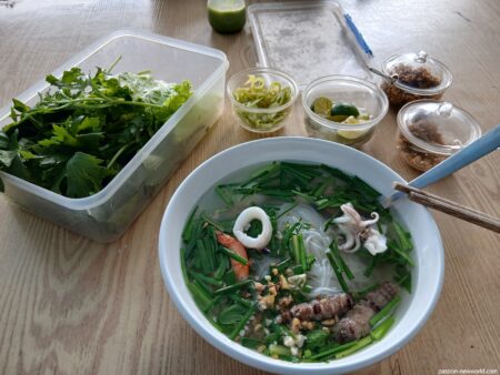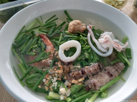 フーティウ・ハイサン(Hủ tiếu hải sản)を注文した。これは、ベトナム南部で親しまれる魚介(ハイサン=海鮮)の旨味が凝縮されたスープが特徴の米麺料理。コシのある細い麺と、エビやイカ、シャコ、タコ、豚肉などの具材がたくさん入っていた。スープはあっさりしつつもコクがあり旨い。付け合わせの野菜もレタス類やハーブ類などたっぷり。5万ドン(300円)。