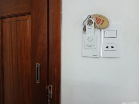 レセプションは至極質素。パスポートを見せると、すぐに鍵を渡してくれた。受付の女性は朗らかで