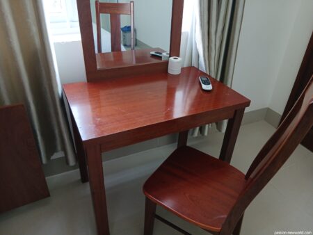 窓側に書斎机と椅子。椅子は木製なので座るとお尻が痛くなってくるのが残念。