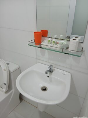 洗面台。アメニティーは歯ブラシ、ボディージェル、綿棒。