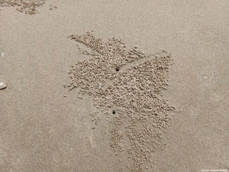 一方、砂浜には小さな穴が無数にできている。そして穴の周りには細かい砂団子が。しばらく立ち尽くしていると小さな穴から蟹が顔をのぞかせる。穴を掘った時に出る砂を丸めて外に並べているのだ。人の気配を察知すると、すぐに穴の中に隠れてしまう。