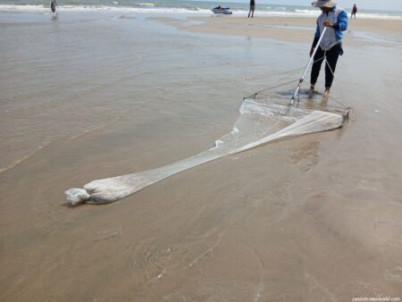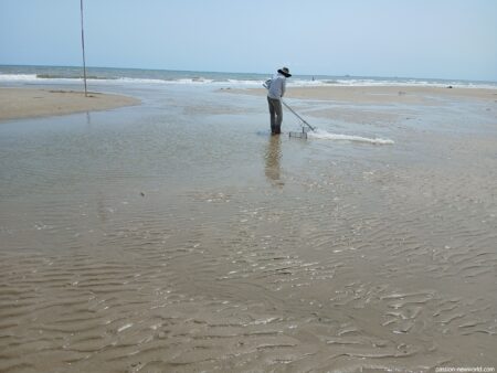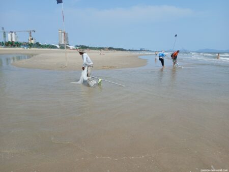 砂浜の砂を網の中に入れて、たまったら海水で砂を除去。その後に網の中に残っていたのは大量の貝殻だ。料理用の貝を集めているのだろうか?