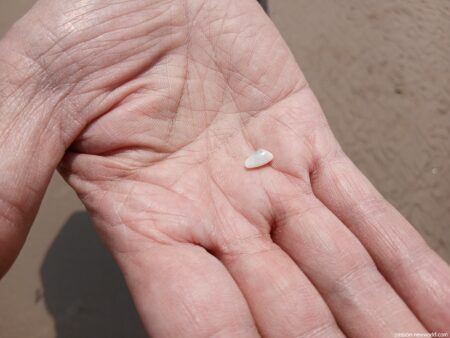 これは小さすぎて売り物にならないのだろう。ただ、よく見ると不思議な光沢があり美しい。これより大き目のものを収穫してジュエリーに加工するのではないか。そんな商売もあるんだ、と納得。