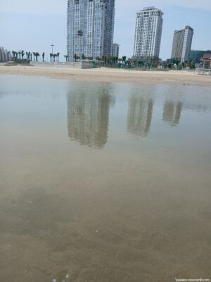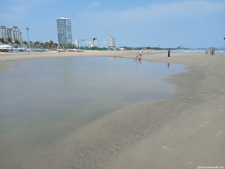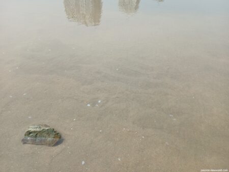 満潮時には海水で覆われてしまうビーチ。干潮時にできた巨大な水たまりをのぞきこむと熱帯魚のような魚はいなかったが、小さな魚がたくさんいる。写真では分かりずらいが、けっこうすばしこく泳ぎ回っている。
