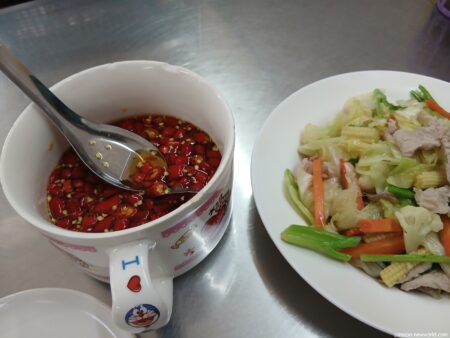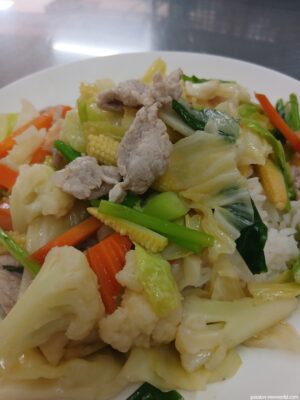 肉もいいのだが、野菜もたっぷり食べたくなる時がある。ちょうど、ピッタリの良いメニューがあった。味付け薄目で食べやすい一品。キャベツ、ニンジン、ヤングコーン、白ブロッコリー、小松菜ぽい青菜、そして厚めの豚肉。調味料の主役はナンプラーでオイスターソースが隠し味か。水溶き片栗粉を少しだけ使っているのか、とろみが旨味を包み込んでいる。優しい味わいなのでどんどん食べられる。