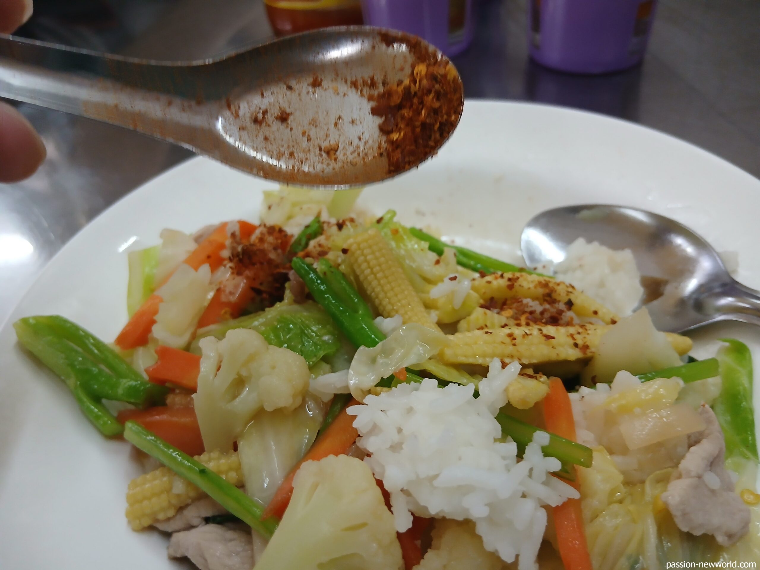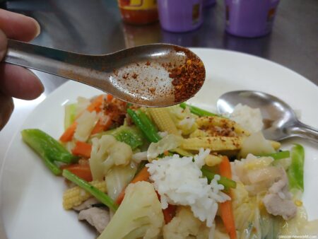 半分ほど食べて、唐辛子ナンプラーと唐辛子パウダーの投入で味にアクセントを付ける。