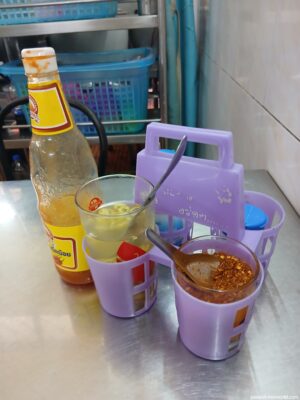 3分の1ほど食べて味にアクセントを付ける。卓上の4種調味料セット(クルアンプルン)は砂糖、ナンプラー、酢とうがらし、唐辛子粉の4セット。これらを使って好みの味に調整するのが一般的なのだ。筆者は酢とうがらしをたっぷり投入。ナンプラーも足して濃いめに味変。