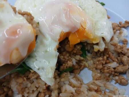 タイ料理の定番中の定番。周囲を見てもこれを注文している客はけっこう多い。鶏肉と豚肉から選べる。筆者は豚肉にした。粒大き目の豚ひき肉をバジルと唐辛子で一気に炒める。出来立ての熱々なので旨そうな香りが立ちのぼってくる。