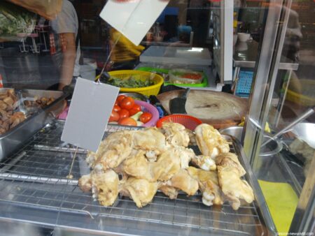 店先にある鶏肉の塊が目を引く。