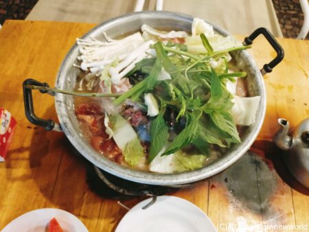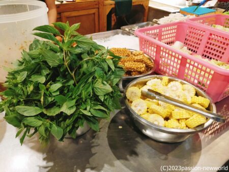 取り放題の食材コーナーで存在感を示す緑のハーブのタイバジル(Thai basil:โหระพาホーラパー)。ミントっぽい香りがするが、そこまで強烈ではない。適度に苦みがあって口と胃の中がスッキリする感覚か。茎の部分は食べず、葉っぱをハサミで切り落として鍋の中に入れていく。