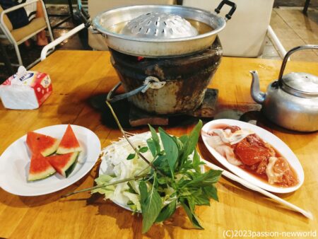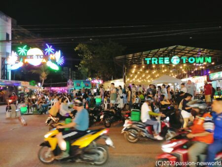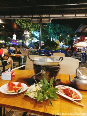 今回は1人のため食材をじっくり吟味しながら楽しんだ。豚肉の種類はロース、レバー、ホルモン、バラ肉などがあり、野菜類は白菜、キャベツ、エノキ、シメジなど。チャーハンとスイカ、アイスクリームも食べ放題。どれもいちいち旨い。すっかり満腹になって気が付くと外は真っ暗。ツリータウン内のバービアが賑わい始めた。