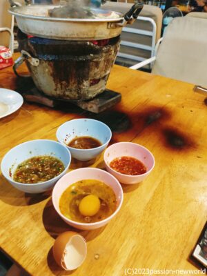 地元の常連客によると、赤いタレは甘辛く、肉に付ける。青っぽいタレは主にシーフード用。筆者は赤いタレと青いタレをまぜて、日本のすき焼き風に生卵を落としてみた。これを混ぜて肉に付けて口に運ぶと、お! これはいける。舌がしびれるような青唐辛子の激辛がマイルドになって奥深い味わいを醸し出している。