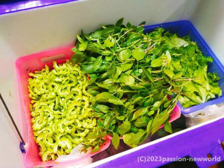 店先には大量のタイバジルとゴーヤの千切り。