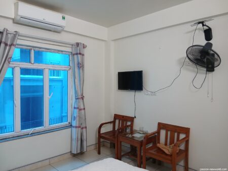 木製の椅子に机。壁に液晶テレビと古い扇風機。