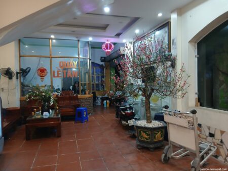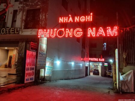 この日の宿は「PHUONG NAM」。ネオンサインの上に宿を意味するベトナム語の「ニャギ」という言葉が見える。