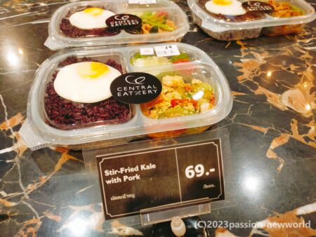 タイの国立大学が開発した黒紫色の「ライスベリー」を使った見た目美しいお弁当パック。 このライスには抗酸化作用をもつポリフェノールや食物繊維が含まれており亜鉛、鉄、ビタミンB1、ビタミンE、葉酸、オメガ3など体に良い栄養素が多いという特徴がある。ライスの上には目玉焼きがちょこんとのっていてカラフルだ。1か月前は65バーツ(260円)だったが、4バーツ値上がりして69バーツ(276円)になっていた。バーツ/円レートも円が弱まり円安方向に。バンコクに比べてパタヤの物価は安くてリーズナブルと思っていたが、じわじわと財布への負担が増えている。