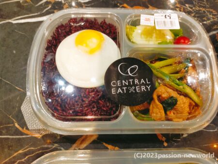 今回販売されていたお弁当は3種類。おかずは、トマトとエビの野菜炒め、豚肉のハーブ炒め、豚肉のピリ辛炒め。ライスはいずれも黒っぽい深紫色の「ライスベリー」。値上げされたとはいえ、60バーツ台で何とか踏みとどまっている。これなら、まだお買い得と言えるだろうが、70バーツ台に入ってくると、少し躊躇したくなる。