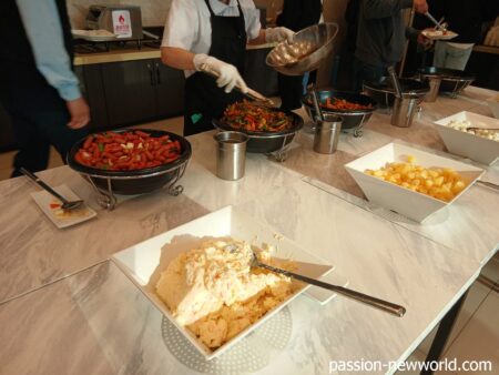 おいしそうなおかずが並ぶ。ポテトサラダ、パイナップル。