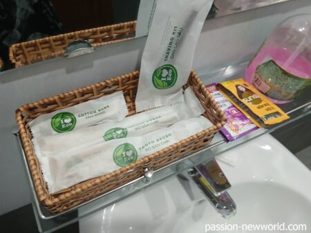 アメニティーがそろっている。歯ブラシ、カミソリ、綿棒、シャンプー、リンス。