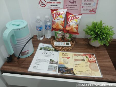 電気ケトルとミネラルウォーター2本。お菓子とカップ麺は有料。
