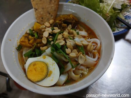 ミークゥアンはその店によってさまざまな種類がある。こちらでは煎餅が黒ゴマ入り、ゆで卵は半分に割ったもの、麺は他店よりやや幅広だ。