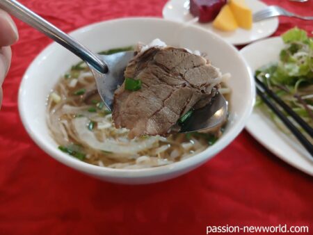 フォーと言えば牛肉でしょ。こちらを注文すると、若いあんちゃんが「よっしゃぁ!」とばかりの元気な返事でスープを注いでくれた。
