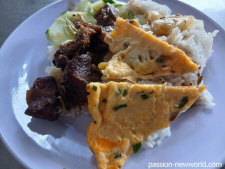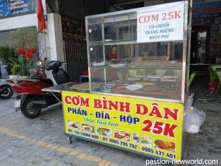 途中で左折し路地に入ると、小さなワゴンを出している食堂を発見。1皿2万5000ドン(約180円)だ。