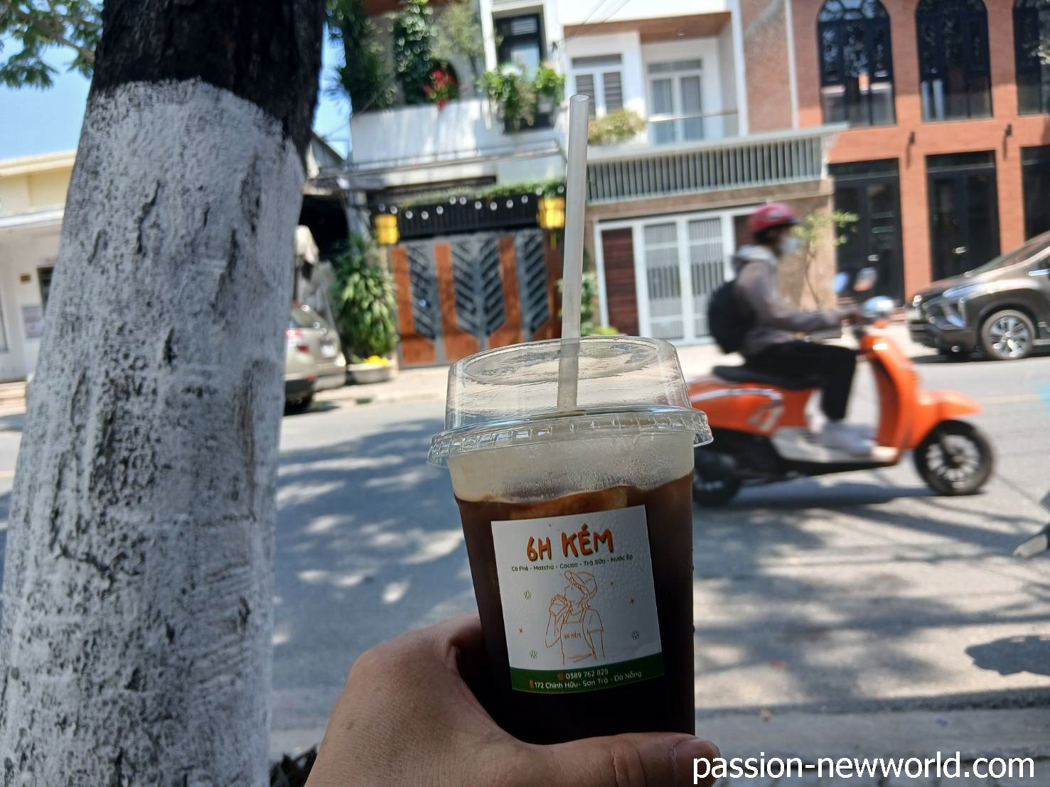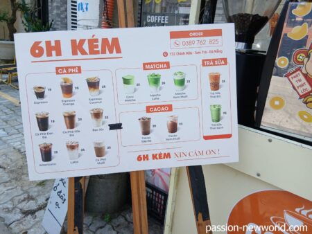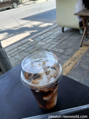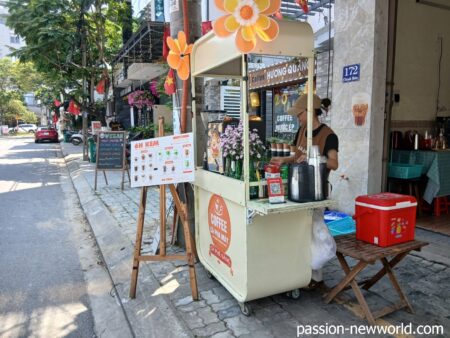 10分ほどで完食。ホテルのビュッフェもいいけど、こういうどローカルな飯にも風情がある。ただし、衛生状態に神経質な方は控えた方がよいかも。食べ終えて少し歩くと今度はカフェ発見。ココナツエスプレッソが2万5000ドンだ。