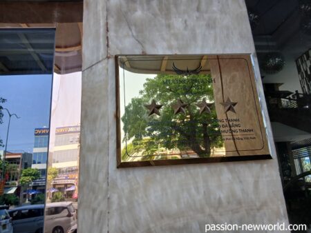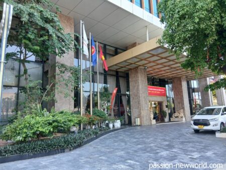 15分ほどでムオン タン グランド ダ ナン ホテルの正面エントランスに到着した。国旗がはためきタクシーが何台も客待ちしていてゴージャスな雰囲気だ。