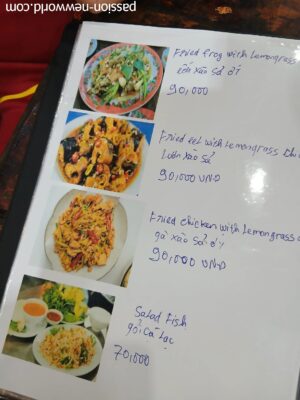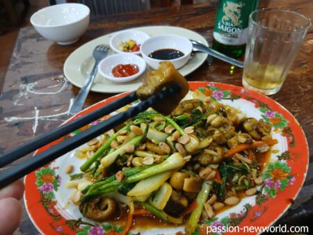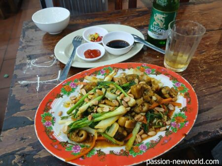 店内に入りメニューを見ると…。上から2番目。確かに「ウナギ」の表記。レモングラス炒めである。これを注文し、ビールも。置いてあるのはサイゴンビールだけ。