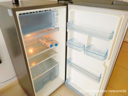 冷蔵庫は大きくて清潔。ミネラルウォーター2本入り。