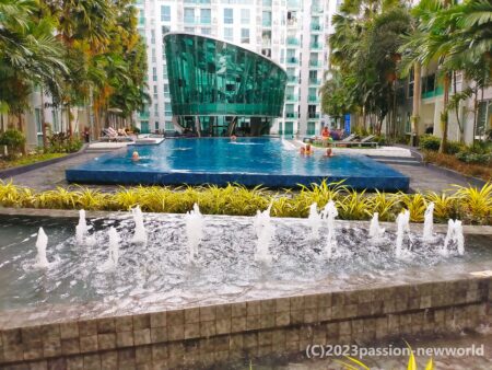 コンドミニアムにありがちなのが所有所との鍵の受け渡しをめぐるトラブルだ。今回も例のごとく、部屋の所有者にメールを送ったが、返信はなし。不安を抱えて現地に行くことになった。守衛がいたので鍵について聞くと「こちらで渡します。宿泊日とオーナーの名前を教えてください」という返事。「チェックインは今日。オーナーはKimさん」と告げて、agodaの予約完了メールを見せると、簡単に鍵を渡してくれた。ゲートをくぐると出現する壮麗なプール。円形のガラス張りの建物の中にはフィットネスマシーンが完備されている。