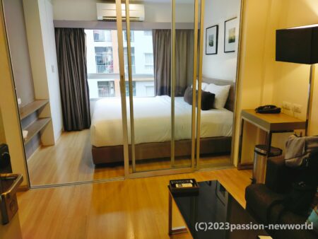 室内はダブルベッド1台、 26 m²、禁煙。リビング、寝室、キッチンに分かれており、移住感覚が楽しめる。テレビ、冷蔵庫、電子レンジ、セイフティーボックス、ドライヤーなど必要なものはほぼそろっている。