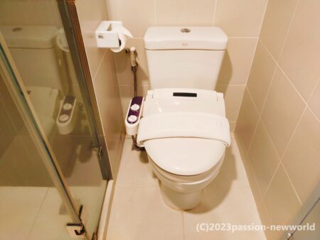 トイレはウォシュレット付き。日本と違いスイッチをひねるとだんだん水勢が強くなるタイプ。シャワー室との間にはガラス板の仕切りがあるのでトイレがびしょ濡れになることはない。