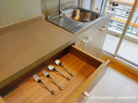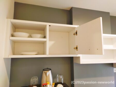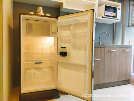 冷蔵庫は大型。パタヤ定番のミネラルウォーター2本付き。キッチンシンクの上に電子レンジ。湯沸かし器、お皿やスプーン類もそろっている。