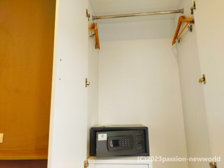 ベッド枕元の上には品のいい絵画。タンスの中にはセイフティーボックス。