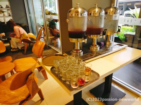 ロビーには予約者が大勢。ウェルカムドリンクはかなり甘め。