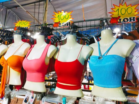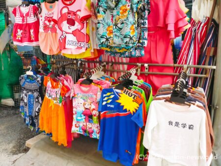 とても庶民的な佇まいで、店舗の上には屋根があるため雨が降っても濡れない。肉類や御菓子類など何でもあり、の買い物天国。中でも多いのが洋服屋さん。