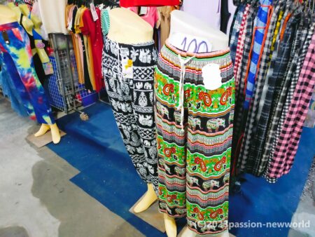 こんなにカラフルなデザインの像パンツは初めてみた。とても美しい。パジャマにして寝たら縁起のいい仏様の夢をみそうだ。女性用、ショートだけのトップスも100バーツ(400円)から。見た目が涼しそう。