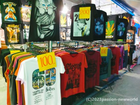 お土産用のTシャツを物色していると、センタン近くのナイトマーケットにある洋服店のような店がたくさんある。安いもので100バーツ(400円)から。往年のロックバンドの凝ったデザインのTシャツは200バーツ(800円)からとなっている。