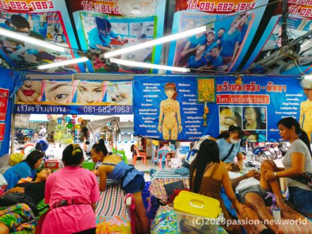 洋服だけではなくお年寄りを集めてのツボ体験のようなコーナーもあった。庶民の生活がダイレクトでつたわってくるようなブアカオ市場。散歩がてらに行ってみると意外な掘り出し物に出会えそうだ。