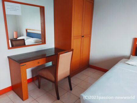 ベッドは大きく快適だ。ただ、全体的に老朽化は否めず、パタヤにありがちな閑散ホテルに近づいている、といった印象。宿泊客も少ないようであまり活気がない。WI-FIもそれほど強くはないため、時々接続が切れてしまう。