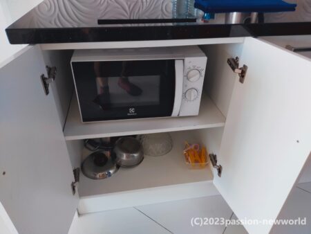 こちら電子レンジ。ブアカオ常設市場で買い込んだタイ米とおかずを温めて食べた。