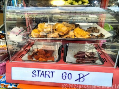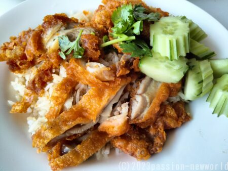 ブアカオ常設市場内にある屋外飲食店舗の「リナチキン」。この日は、香ばしく焼いたチキンが食欲をそそる「揚げチキンライス」を試してみた。