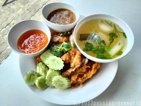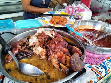 料理は60バーツ(240円)から。店先には煮豚や揚げたチキンなどが並んでいる。どれも美味しそう。
