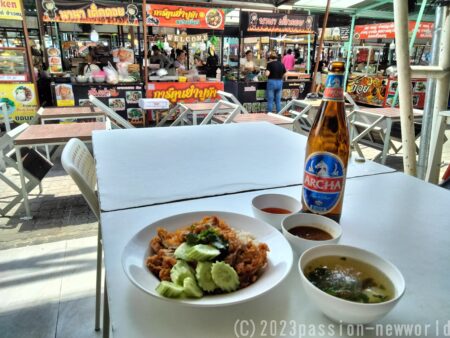 暑いのでビールも買ってきた。2種類のタレも甘口、辛口とあり交互にチキンをつけて食べると味の変化が楽しめる。スープは大根とパクチー。優しい味わいながらコクがありしっかりしたのどごしだ。のんびり過ごすパタヤの昼下がり。幸せを感じる一時だ。
