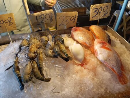 かなりの人気店なのか、氷の上に並べた魚介類はどんどん注文されていく。まず、食べたい魚やエビ、イカを指さして、次に調理法をおおざっぱに伝える。焼く、煮る、揚げる、味付けはガーリック、サワー、スイート、スパイシー、ベジタブル、ハーブ、レモン…などと思いついた言葉を並べていけばだいたい通じる。タイは調理代込み、イカ炒めは野菜代などを追加した料金だった。