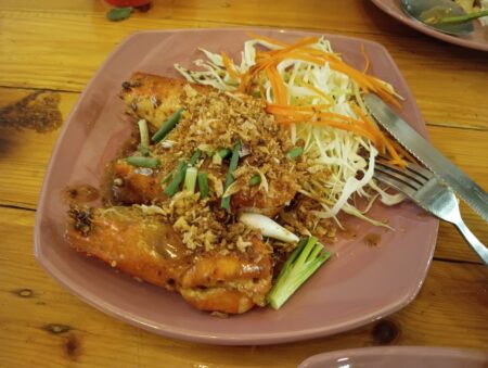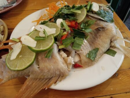 おお!これはすごい。蒸し煮したタイの上にレモンの輪切り、ハーブ、ガーリック、唐辛子がたっぷりとのっかっている。身も思ったほど縮んでいない。これまではほとんど揚げてもらい、ガーリックと唐辛子、ナンプラーで味付けしてもらっていたが、揚げるとかなり身が縮む。蒸し煮だとそれがあまりないようだ。スプーンとフォークを駆使して身を削り、口に運ぶと甘味のあるタイの身とハーブ、ガーリックの風味が口全体に広がり絶妙な味わいだ。