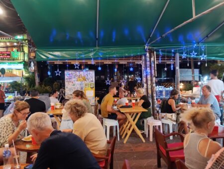 屋外席も含めて外国人観光客で満席だ。それも当然。リーズナブルでしかも旨いとあればあちこちから人が集まってくる。お会計はビール大瓶計5本を含め1550バーツ(6666円)。友人は「安くておいしかったね」と大喜びだ。カオサンでシーフード。かなりオシャレなひと時ではあった。