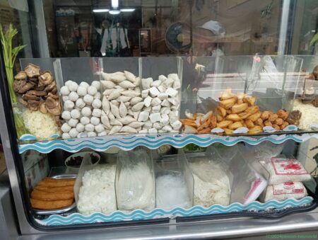 店頭には魚肉類や豆腐類がたくさん陳列されている。見るだけで食欲をそそる。お値段60バーツ(258円)。